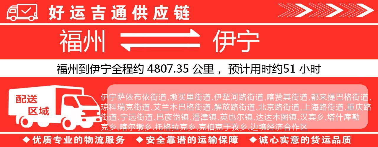 福州到伊宁物流专线优选好运吉通福州物流公司全程约4807.35公里,专线用时约51小时,预计9-12天即可送达伊宁萨依布依街道、墩买里街道、伊犁河路街道、喀赞其街道、都来提巴格街道、琼科瑞克街道、艾兰木巴格街道、解放路街道、北京路街道、上海路街道、重庆路街道、宁远街道、巴彦岱镇、潘津镇、英也尔镇、达达木图镇、汉宾乡、塔什库勒克乡、喀尔墩乡、托格拉克乡、克伯克于孜乡、边境经济合作区。